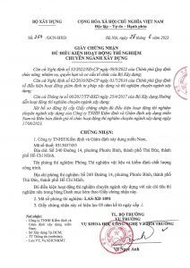 Ngày 28/06/2023, Bộ Xây dựng đã có Giấy chứng nhận số 254/GCN-BXD về việc Công ty TNHH Kiểm Định & Giám Định Xây Dựng Miền Nam đủ điều kiện hoạt động thí nghiệm chuyên ngành Xây dựng.