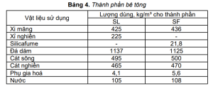 Trong nghiên cứu đã sử dụng 02 cấp phối bê tông cường độ cao sử dụng phụ gia khoáng là xỉ lò cao nghiền và silicafume. Hỗn hợp bê tông được thiết kế đạt mác độ sụt D1 (độ sụt 10-40 mm). Thành phần bê tông được trình bày tại Bảng 4.