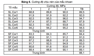 Theo chương trình thí nghiệm, với mỗi thành phần đã lấy 6 mẻ trộn để có được 6 cặp tổ mẫu. Mỗi tổ mẫu gồm 3 viên. Kết quả thí nghiệm xác định cường độ chịu nén của bê tông xác định theo mẫu đúc và mẫu khoan được trình bày tại Bảng 5 và Bảng 6.