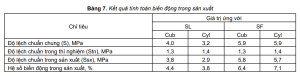 Đánh giá biến động trong sản xuất được thực hiện thông qua hệ số biến động trong sản xuất. Độ lệch chuẩn trong sản xuất ( Ssx ) được tính toán dựa trên độ lệch chuẩn trong thí nghiệm ( Stn ) và độ lệch chuẩn chung ( S ) theo công thức 1. Trong đó độ lệch chuẩn chung được tính bằng độ lệch chuẩn giữa các tổ mẫu thí nghiệm cùng hình dạng kích thước. Kết quả tính toán trình bày tại Bảng 7.