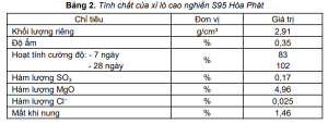 Bê tông cường độ cao trong nghiên cứu được chế tạo với các vật liệu tại nhà máy của công ty Vietnam VG Industry. Chất kết dính sử dụng bao gồm xi măng Nghi Sơn PC50 kết hợp với phụ gia khoáng hoạt tính là xỉ lò cao nghiền S95 Hòa Phát hoặc silicafume. Tính chất của xi măng và phụ gia khoáng được trình bày tại Bảng 1, Bảng 2 và Bảng 3.